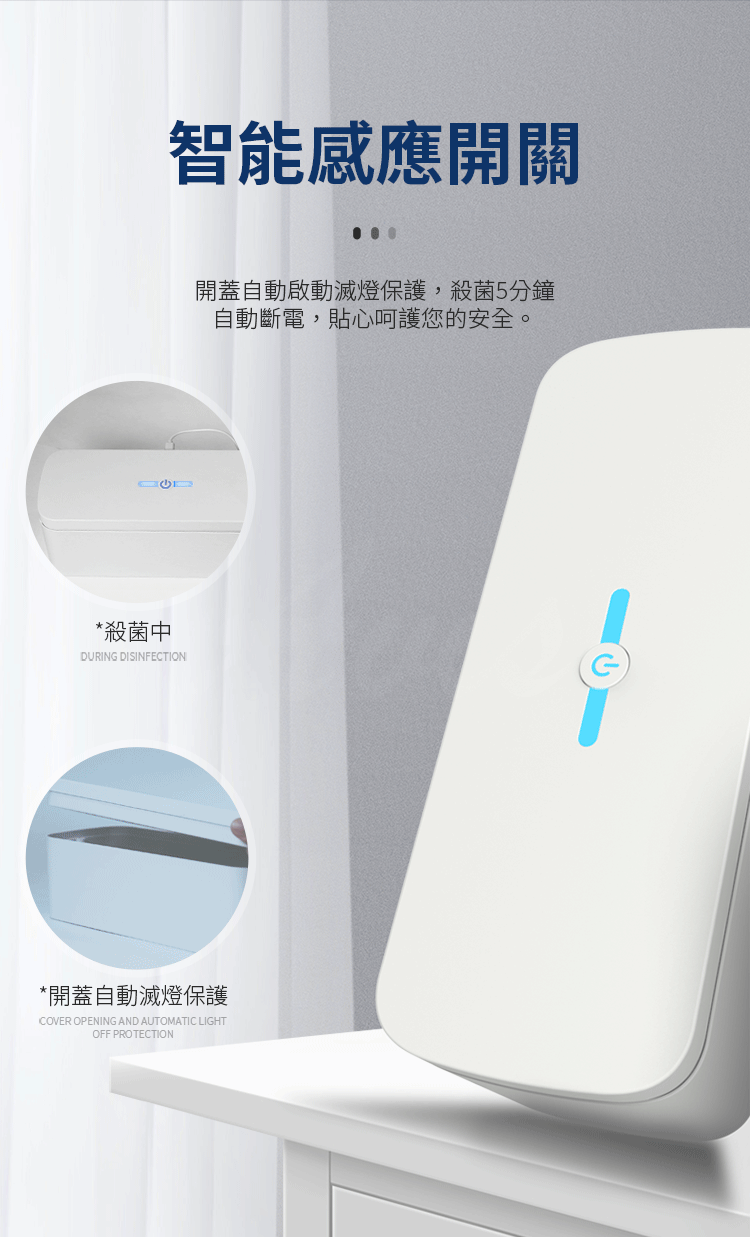 智能保護系統~開蓋自動啟動滅燈保護,殺菌5分鐘自動斷電