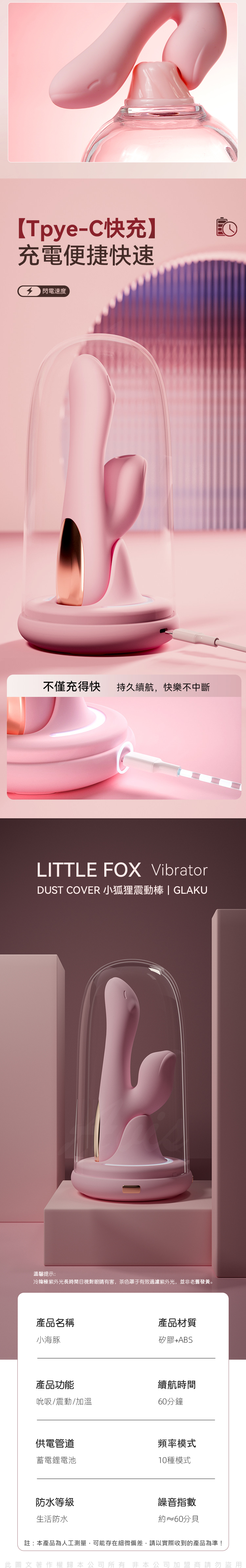 小狐狸震動棒,消毒抑菌創新設計,科技美學與女性健康的偏執狂,一鍵充電消毒, 燈光亮起瞬間帶走污漬,防護罩氣體級密封 ,氣體灰塵細菌入侵阻擋;十頻動感強震,解鎖敏感地帶,縱享急速高潮;十頻動感裹吸,高分吻戲,三維快感體驗;智能恆溫,還原真實體溫,開機狀態下棒頭自動加溫至42度C,忘不了的溫馨體驗!