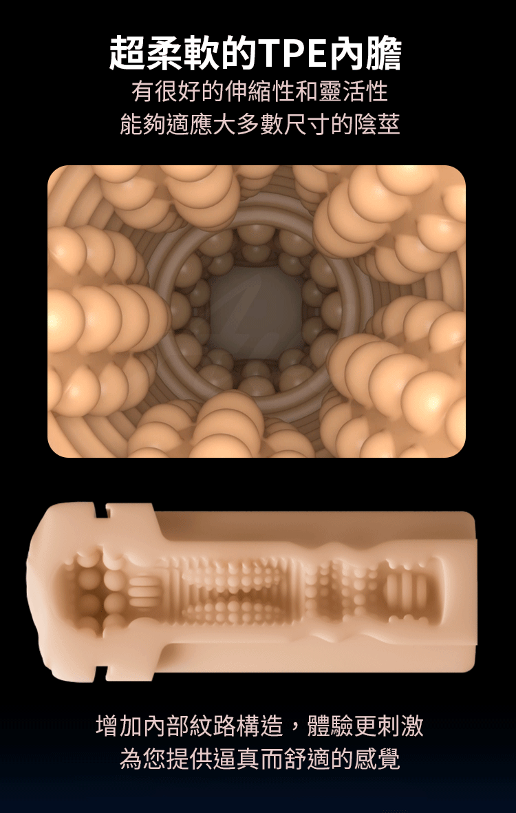 能夠適應大多數尺寸的陰莖。內部紋路為您提供逼真而舒適的感覺,
